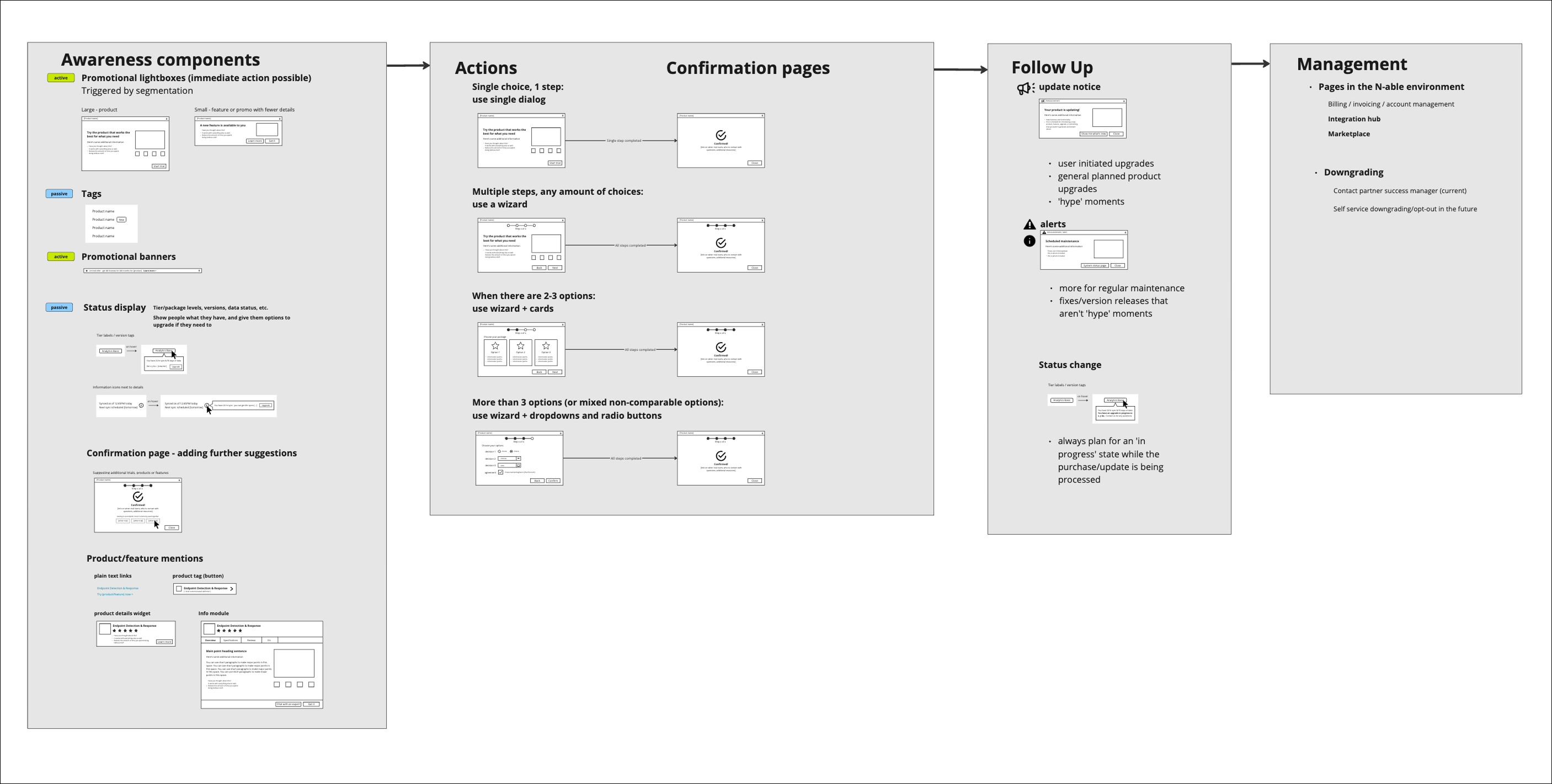 Below shows some guidance I’ve created to strategize with and align cross-team stakeholders, sharing best practices for introducing new information and developing a space for users to expect to accomplish self-service actions.